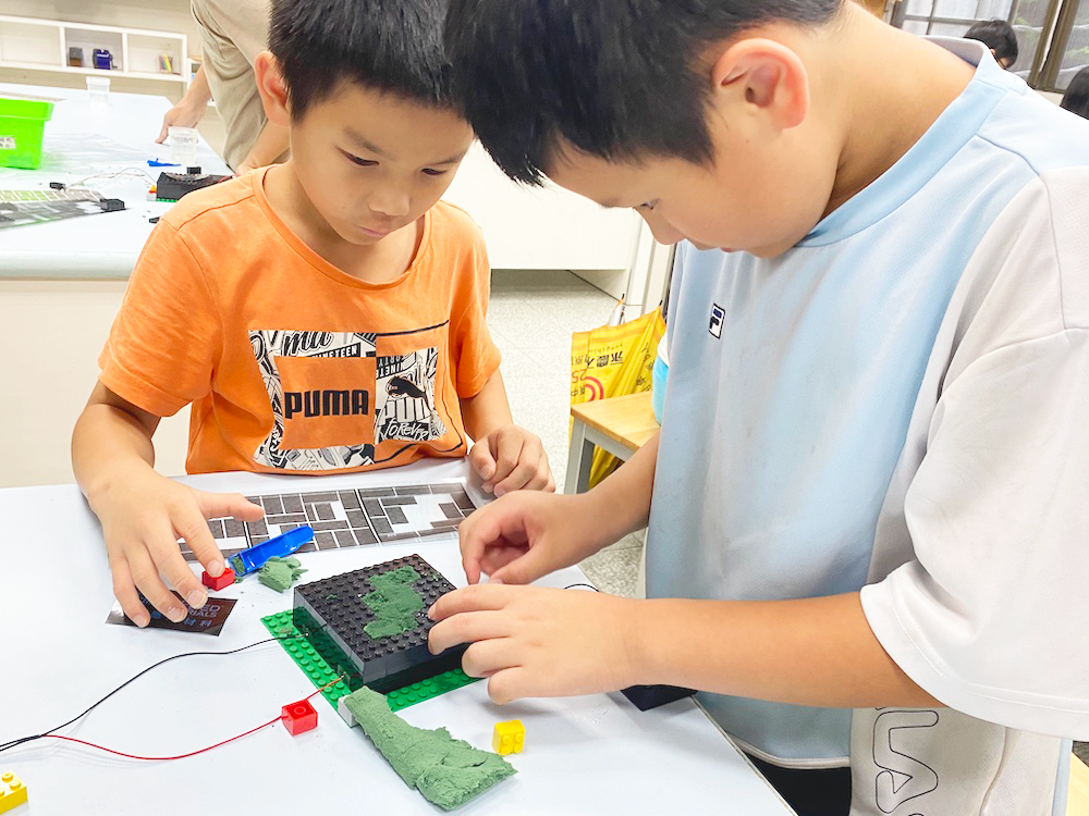 ▲ 孩子們認真地用積木、海綿與簡易電路等工具自行組裝出放大版的立體電路。