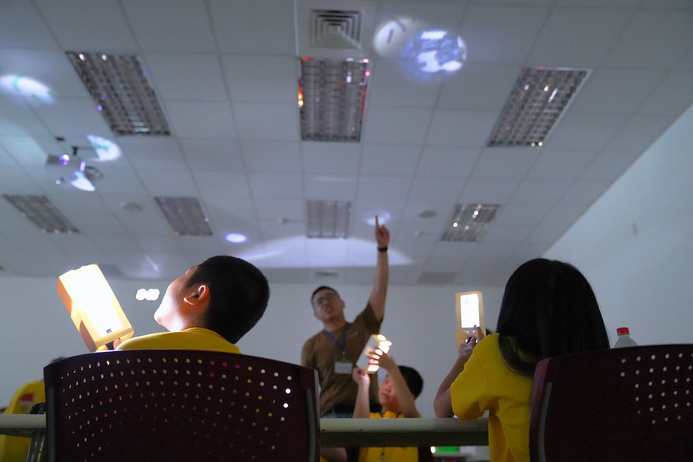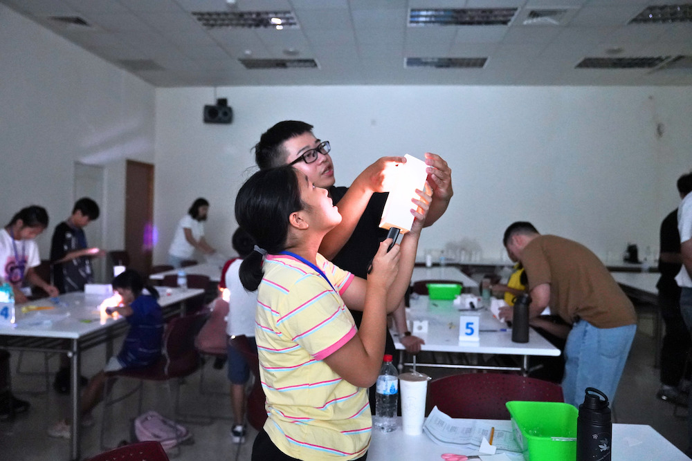 ▲ 孩子們在自製完投影機後,將自己所繪製的圖片,透過手電筒及放大鏡,將成像投影在燈光較暗的教室裡。孩子們玩得不亦樂乎!